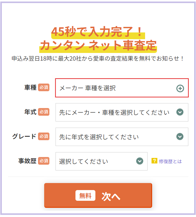 - 最大20社の買取店が一括査定(翌日18時に開示)